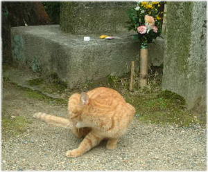 …お参りしていると三橋美智也の歌が流れてきた。誰か100円入れたらしい。イントロに続いておじサンおばサンの大合唱が始まった。…何の会の人だったんだろう??ここで合唱してるのははじめて聞いた。毛並みの良い猫が遊んでいた。 |