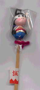 よくある巨大シリーズなんだけど、下のほうに誠の旗を掲げた顔色の悪い犬がいる!他のお菓子も見て見たけど新選組隊士がいたのはコレだけだった。